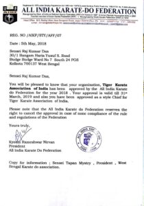 Tiger karate Association India which is an Indian Government registered organization being affiliated by AIKF, FTK and recognized by Government of India, IOA, IOC, IJSK and it offers training in Karate, Judo, Gymnastics, Yogason, Multi Gym, Meditation etc.